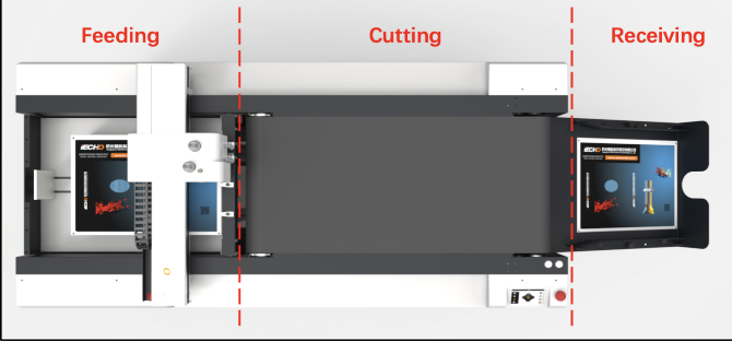 Machine is totally divided into three areas, Feeding, Cutting and Receiving. Vacuum connected with suction cups which is under the beam will absorb the material and transport it into cutting area. Felt covers on the aluminum platform forms the cutting table in cutting area, cutting head installing different cutting tools working on the material. After cutting, the felt with conveyor system will convey the product to the collection area. Entire process is fully automated and requires no human intervention.